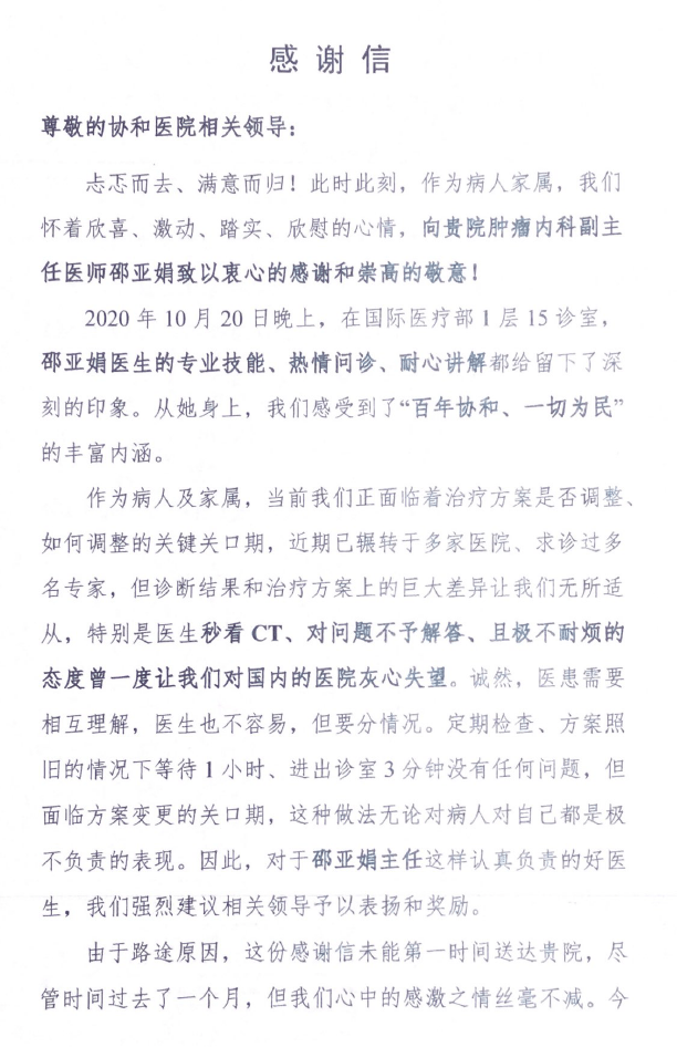 窗外大雪纷飞,窗户暖洋洋的。诊所开业后不久,一位归国患者兴冲冲地来到肿瘤科邵雅娟教授的诊所,亲手将感谢信交给邵教授。归国患者表示,因病情前往北京协和医院就诊时,邵教授的专业知识和技能、热情的询问方式和耐心的回答过程给他留下了深刻的印象,充分感受到了“百年和谐、一切为了人民”的丰富内涵。北京协和医院西单校区始终坚持“以人为本,一切为了患者”的方向,旨在提高医疗服务水平和质量,推广协和的“新服务品牌”。