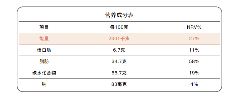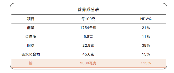2。钠的NRV百分比不应超过能量NRV百分比。“NRV%”(营养素参考值)是指100克食物中这种营养素的含量,它占了这种营养素的日摄入量。